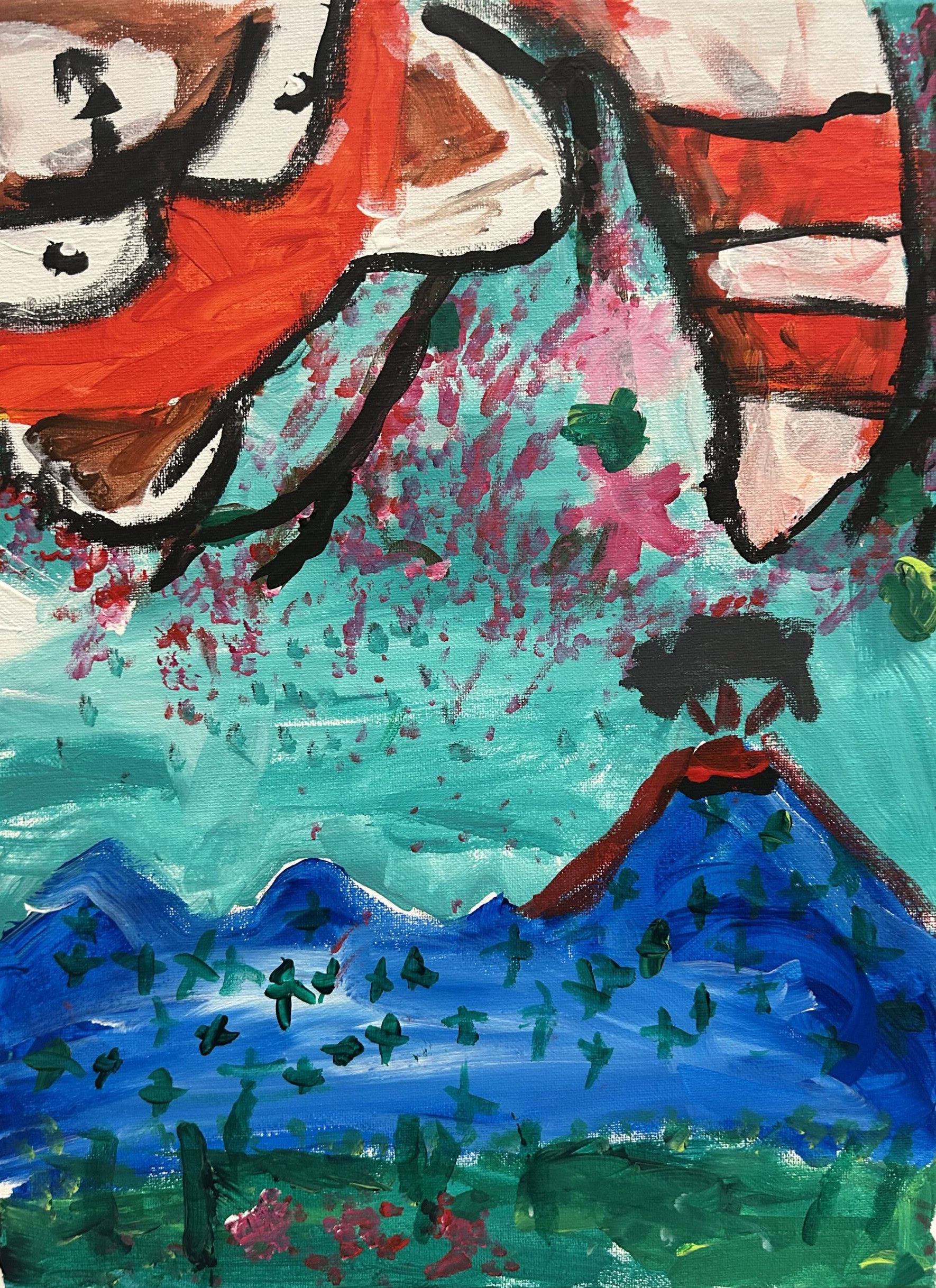 Spray paint, acrylics, and decoupage on canvas
